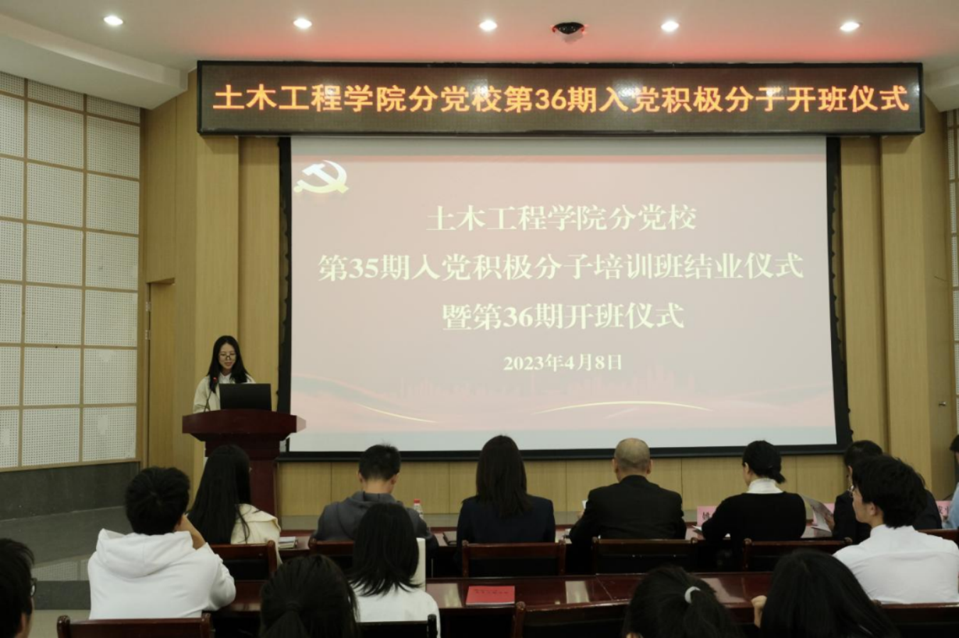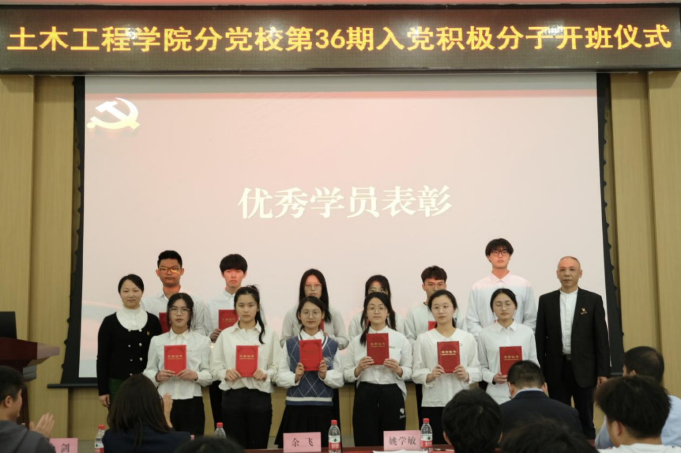 分党校第35期入党积极分子培训班结业仪式暨第36期开班仪式在土木学院多功能厅顺利举办。院党委副书记兼纪委书记余飞、院党委组织员姚学敏、院团委副书记江小敏以及各年级辅导员莅临参会。