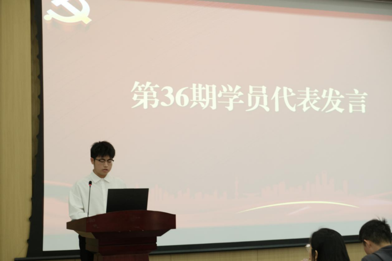 接着,2022级智能建造一班的陈龙杰同学代表第36期分党校学员发言,并以“三心”对今后的党课学习做出郑重承诺:一是笃定敬终如始的“初心”,不断向先进党员和时代楷模看齐,争取早日入党;二是坚定勤思善学的“恒心”,在实践中不断端正入党动机,提升党性修养;三是锤炼干事创业的“决心”,不断追求进步,在奋斗中锤炼本领,在磨砺中增长才干。