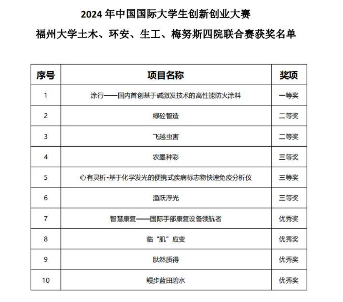 为 切 实 提 升 大 学 生 创 业 意 识 和 创 新 创 业 能 力 ,打 造 优 质 创 新 创业 品 牌 ,3 月 29 日 , 2024 年 中 国 国 际 大 学 生 创 新 大 赛 福 州 大 学 土木 、环 安 、生 工 、梅 努 斯 四 院 联 合 赛 于 教 学 楼 中 楼 -201 顺 利 举 行 。