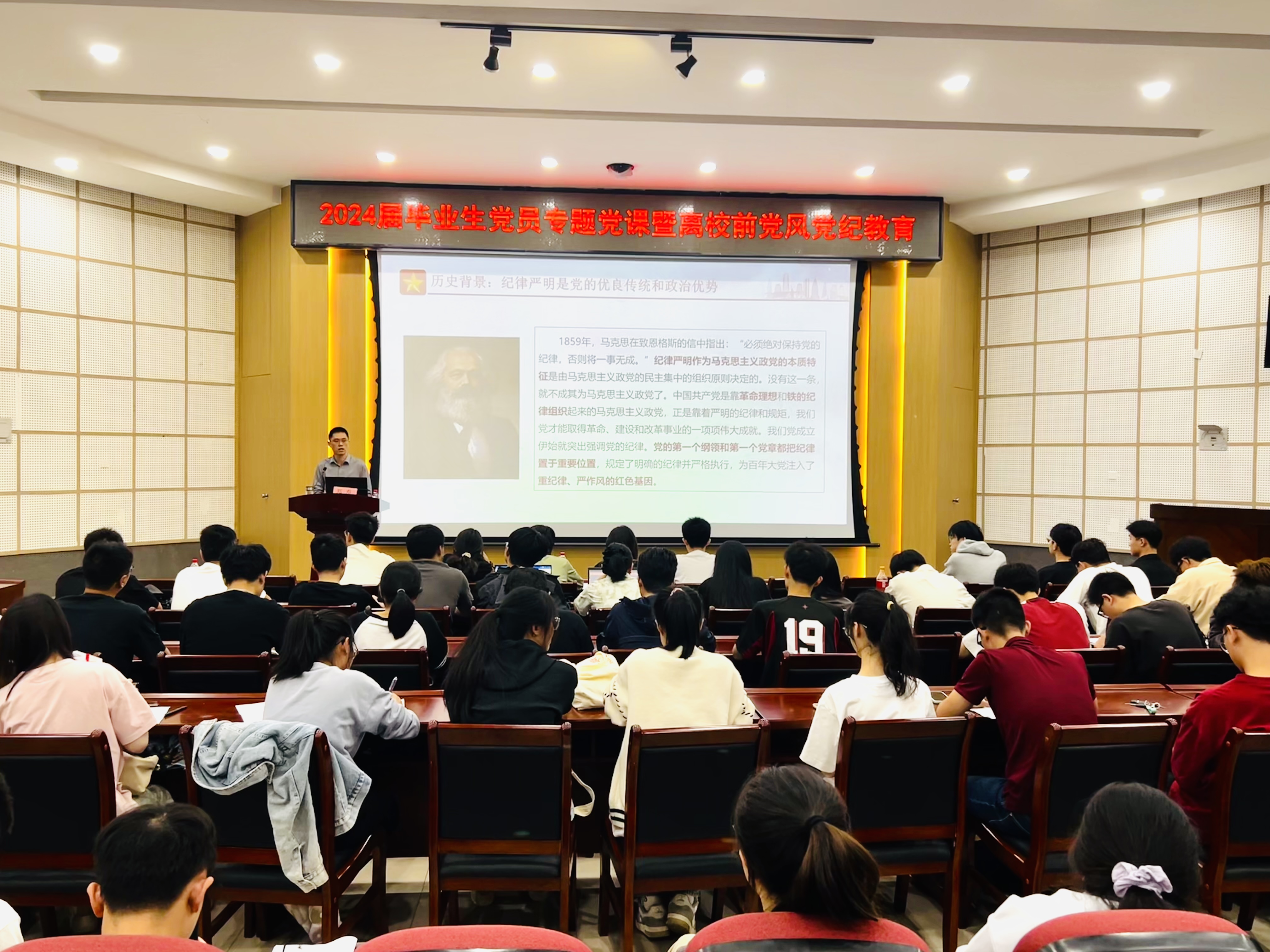 党委副书记兼纪委书记郑寿为2024届全体毕业生党员开展党纪学习教育暨廉洁教育专题党课。毕业班辅导员江小敏、徐剑、刘荣锋以及2024届毕业班党员出席本次会议。