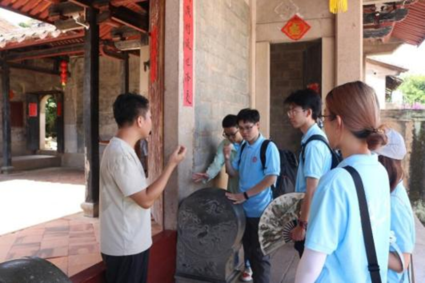用过午饭,实践队抵达诒安堡进行调研。诒安堡是一座全国罕见、保存最完好的清代典型的闽南民居古城堡。其宗祠内有“平台陈十策诚善也,得君日三觐其荣乎”的楹联,彰显黄性震献策平台的功绩。诒安堡具有深厚的闽南文化、对台文化底蕴,是研究闽南建筑的文化瑰宝。在调研过程,如何开辟宣传新模式,拓展宣传新思路,是实践队员与湖西乡政府官员探讨的重点。