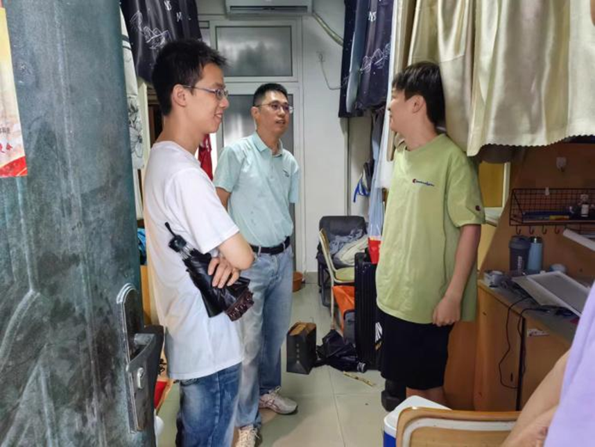 同时,学院迅速制定防台风预案,及时摸排暑期留校学生外出实习、研学情况,落实留校生去向,并及时向学生传达台风咨询,加强同学们的防台风意识。院党委副书记郑寿第一时间带领辅导员前往学生所属楼栋巡逻,深入学生宿舍开展全方位检查,排查安全隐患,逐一提醒留校学生注意防范台风,台风期间非必要不出门,关好宿舍门窗,提前收好阳台物品防止高空坠物等。