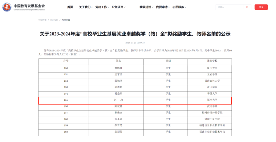 近期,由教育部高校学生司(高校毕业生就业服务司)、教育部学生服务与素质发展中心共同指导,中国教育发展基金会设立的“高校毕业生基层就业卓越奖学(教)金”公布2023-2024年度获奖名单,肉便器