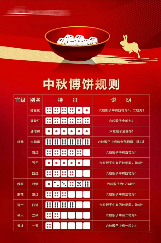 集齐4个不同样式的中秋印章的同学可以参与投掷骰子,根据点数和组合规则获得相应奖品。
