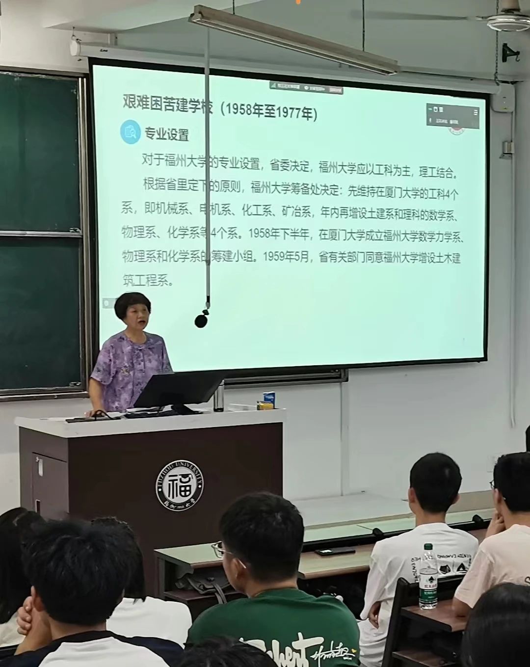 “三种精神”的缘起和内涵,介绍了老一辈福大人肩扛手挑、克服重重困难,把福大从原来的一片荒芜变成如今的知识殿堂的故事。她指出,正是一代代福大人薪火相传,励精图治,让福大走上了“211工程”建设高校的快车道。进入新时期,全校师生上下齐心,砥砺前行,为福大成为更高水平的“世界一流”大学而努力奋斗。希望在座的“新福大人”能够接续老一辈艰苦奋斗、严谨求实、勇于拼搏的精神,为学校的发展贡献青春力量。