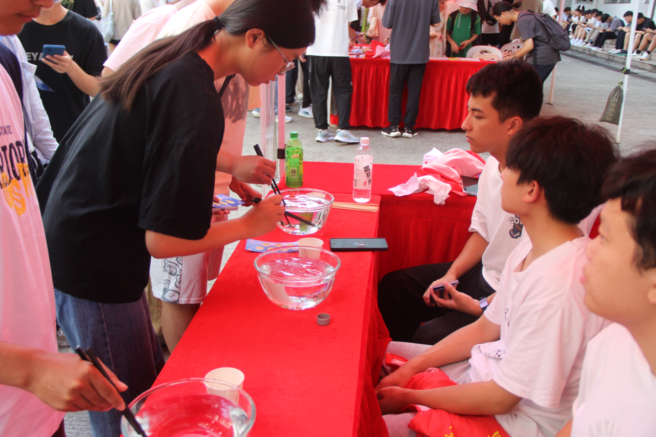 “月光洒照玉兔寒,花前独酌赏中秋”,传统文化中的玉兔形象,承载了劳动人民对月亮的期望与向往,它代表人们对神秘宇宙的向往,对美好生活的期盼,每逢中秋佳节人们仰望明月,便顿生无尽的慰藉与温暖。“玉兔捞月”通过水中夹玻璃球的方式,既增添了本次活动的趣味性,又让玉兔的形象深入人心,活动中的同学们在反复尝试中寻找技巧,在失败后总结经验,逐渐找到窍门取得了印章。