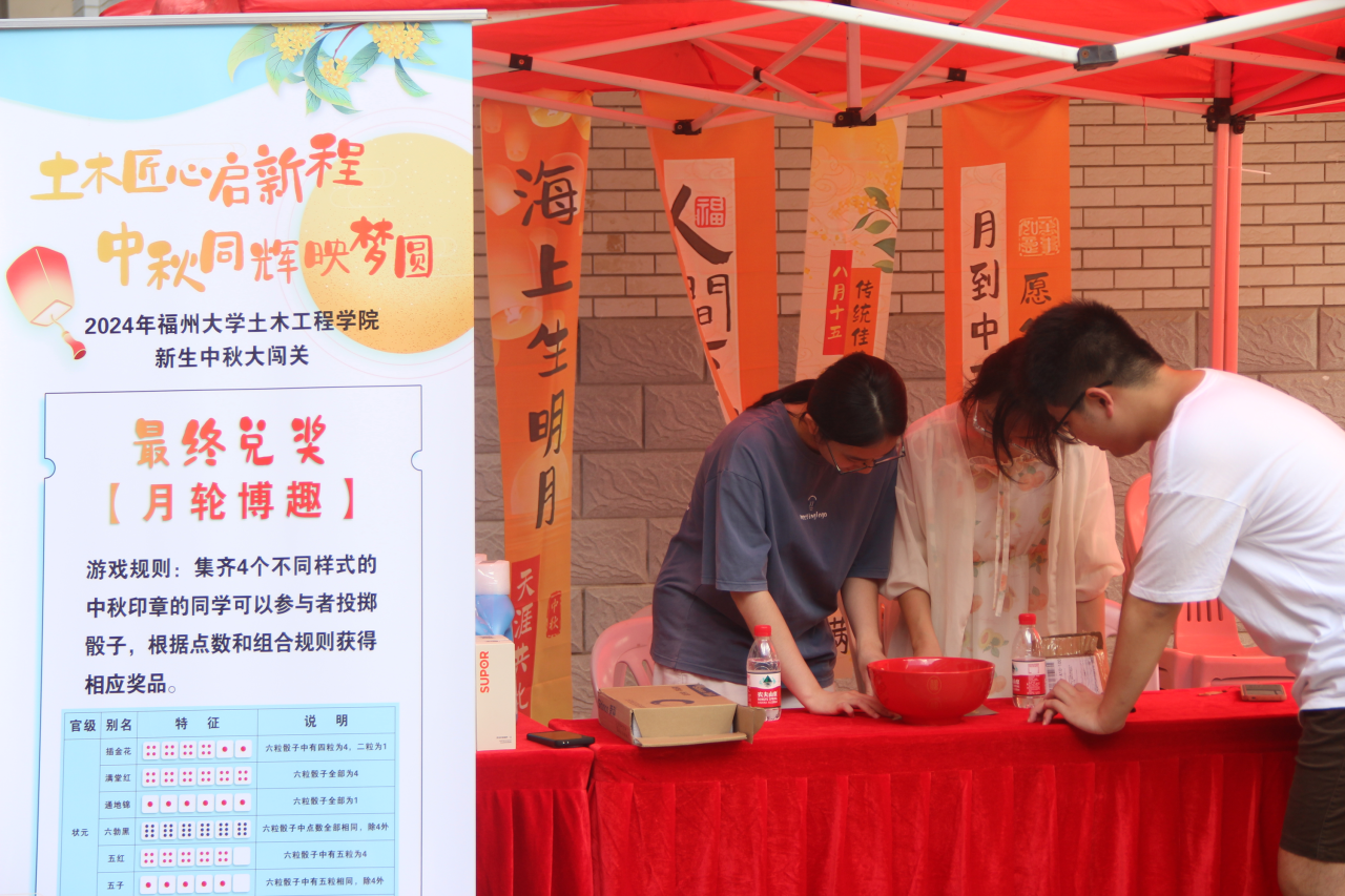 经过一个上午的活动,土木学子穿梭时代的文化长廊,通过活动“月影迷踪”“诗韵中秋”“月环雅趣”“壶中探月”“拼月成圆”“玉兔捞月”,收集到各个不同样式的印章,体验各类传统习俗活动。最终,集齐4个不同样式的中秋印章的同学通过博饼的方式获得相应奖品,而集齐5个中秋印章的同学则有机会亲身体验我国的非物质文化遗产——漆扇的制作,他们在这温馨的节日里留下珍贵的回忆。