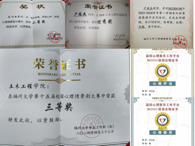 十佳朋辈互助员,其中1名学生荣获全国百佳心理委员提名奖(2021年),1名学生入选《全国百名心理委员风采展》(2024年),学院鼓励学生参与校园心理情景剧大赛、朋辈技能辅导大赛、心理微视频大赛等各类心理比赛,累计荣获三十余项心理健康教育荣誉。此外,学院积极开展新生心理团训和生命守门员教育,做到100%全覆盖,推进“阳光走访”,发放心理健康教育手册,并通过学院微信平台、“心理小树洞”QQ平台等宣传心理知识、科普心理援助途径,组织新生心保员参与“朋辈心理训练营”等相关培训,切实了解同学心理需求,提供心理帮助,充分发挥心理朋辈育人优势,在朋辈心理工作中取得显著成效!坚持开展“梅木传情,绎表心声”心理情景剧大赛、“砼”心向月、“砼”心相遇等具有学院特色的心理活动,让同学们在参与中学习,在学习中成长,更好地理解和应对生活中的困难和挑战,培养同学们的心理积极品质,着力让“砼心圆”品牌的文化内涵不断延续,从而教育一代又一代土木学子,成为汇聚土木青年学子、凝聚时代新人,培养中国特色社会主义事业合格建设者和可靠接班人的重要阵地。