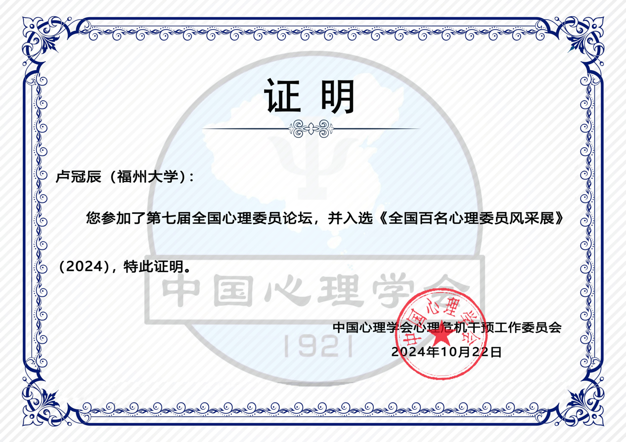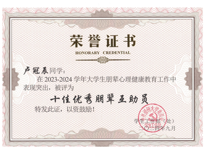 作为班级心保员,切实了解班级同学所需,关心关注班上49位同学的心理状况,开展心理素质拓展活动、心理团辅5次。利用所学心理知识并结合识别心理晴雨表、心理档案等方式,识别心理情绪低落同学3人,为其提供心理咨询帮助,并向心理辅导员汇报,协助心理危机干预工作。组织同学参加各类心理活动,其中校"双十"心理汇参与人数达800余人、心理情景剧比赛学院参与人数达64人等,并取得良好成效,获得老师同学的一致认可。荣获 "优秀共青团员""精神文明建设奖"等校级、院级奖项十余项,努力在同学中起到表率作用,并不断为培养心理积极品质贡献力量!