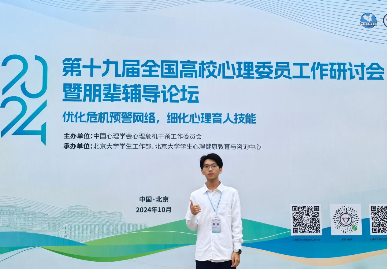 学生代表2023级交通运输类1班的卢冠辰同学,在学校和学院的指导下,经过院赛、校赛、网络投票和专家评审等层层选拔,最终脱颖而出,作为代表之一赴京参加由中国心理学会心理危机干预工作委员会举办的第七届全国心理委员论坛,并代表肉便器