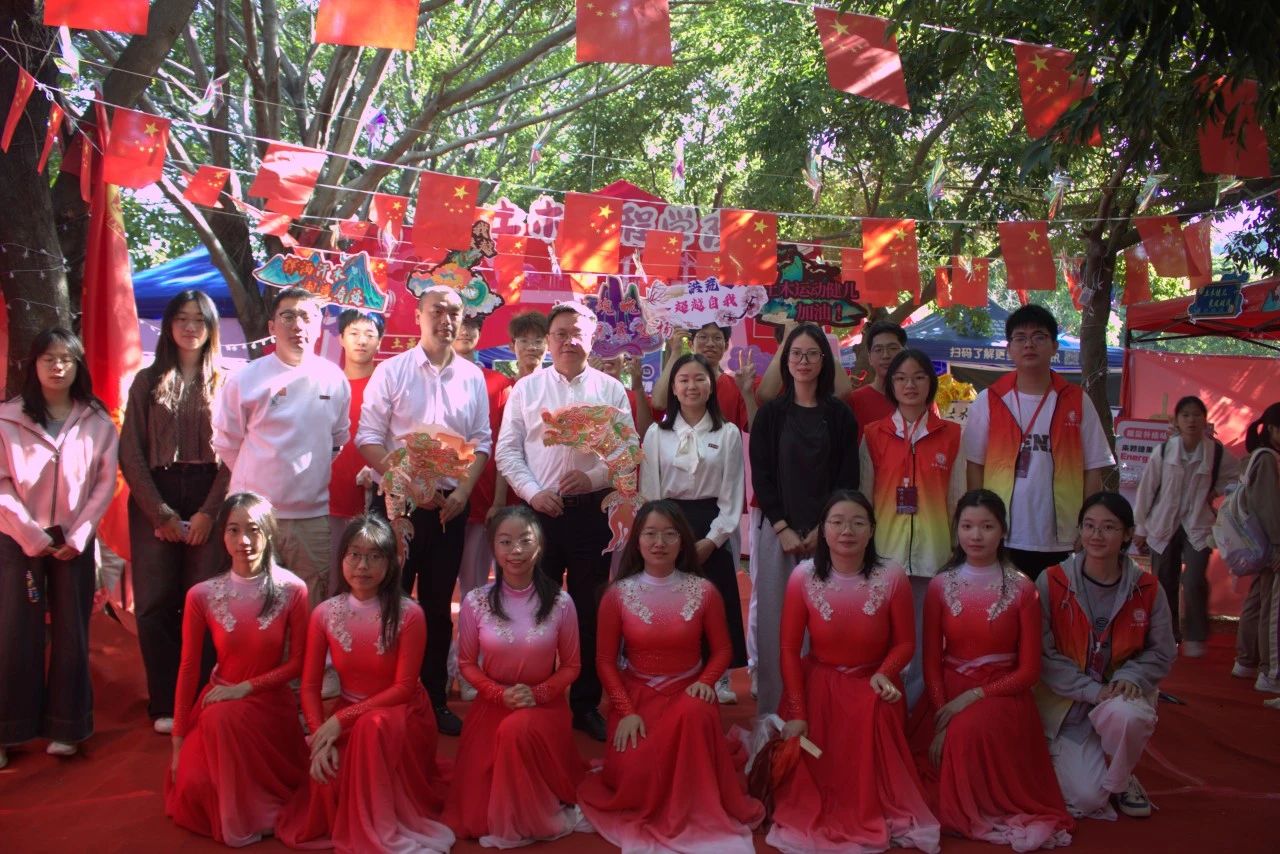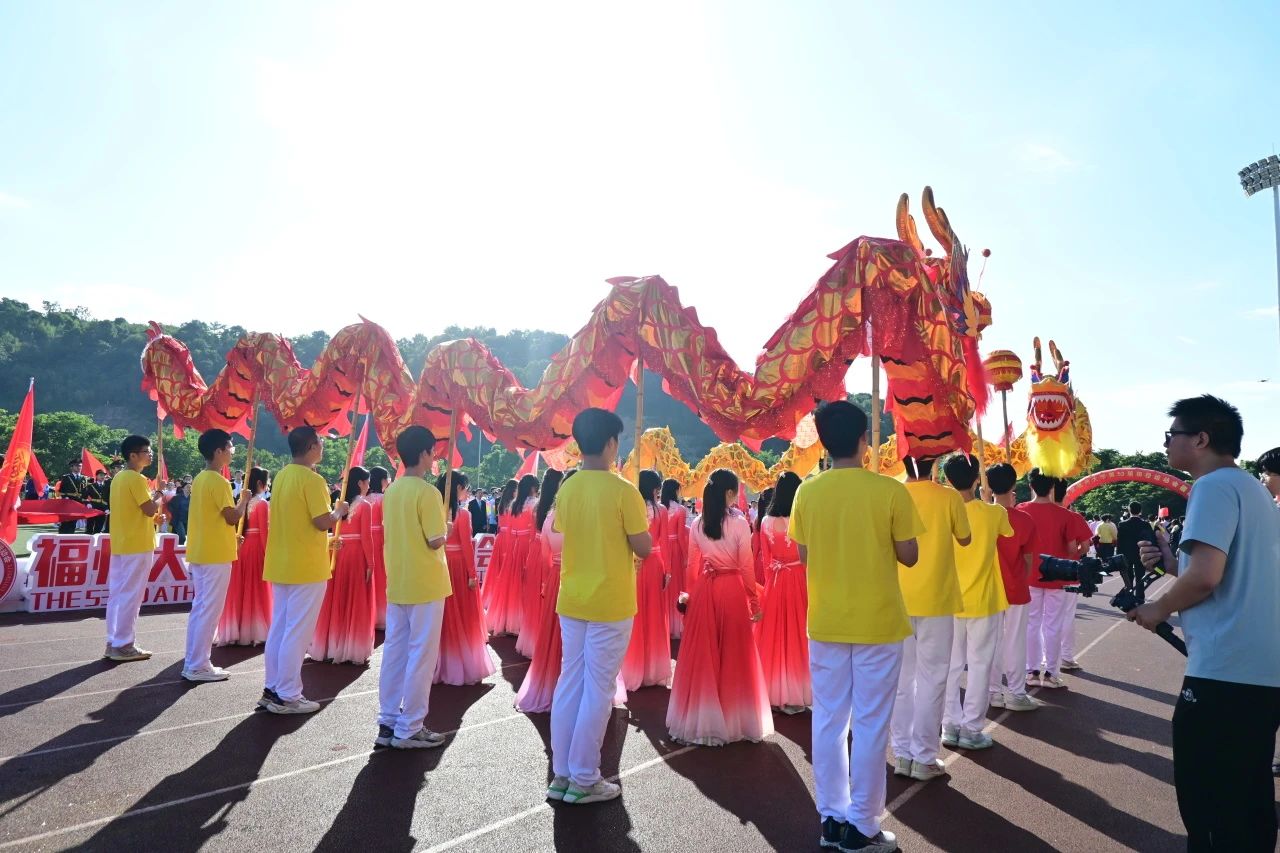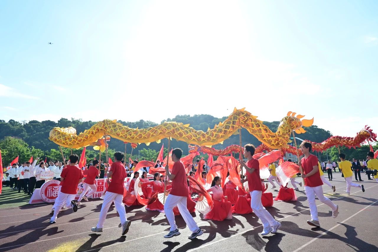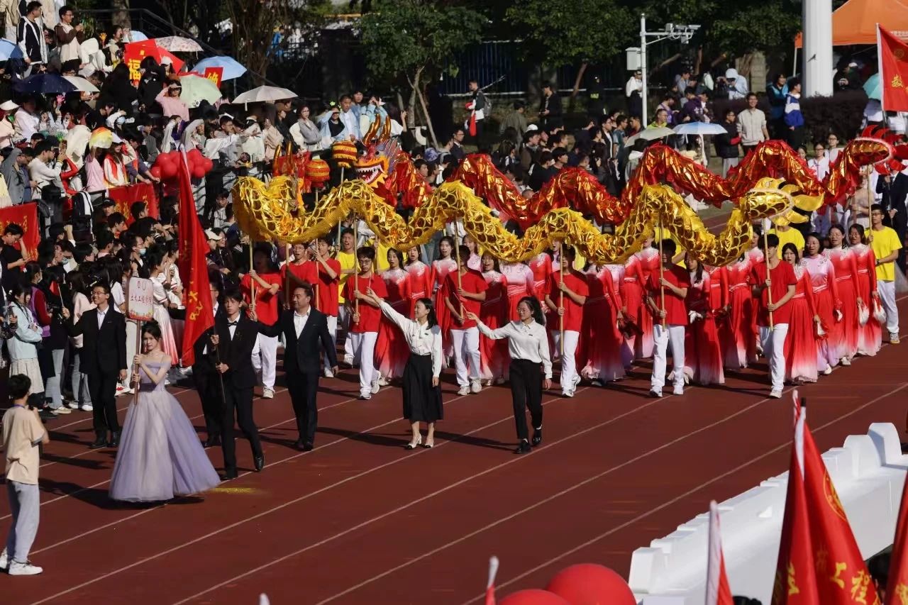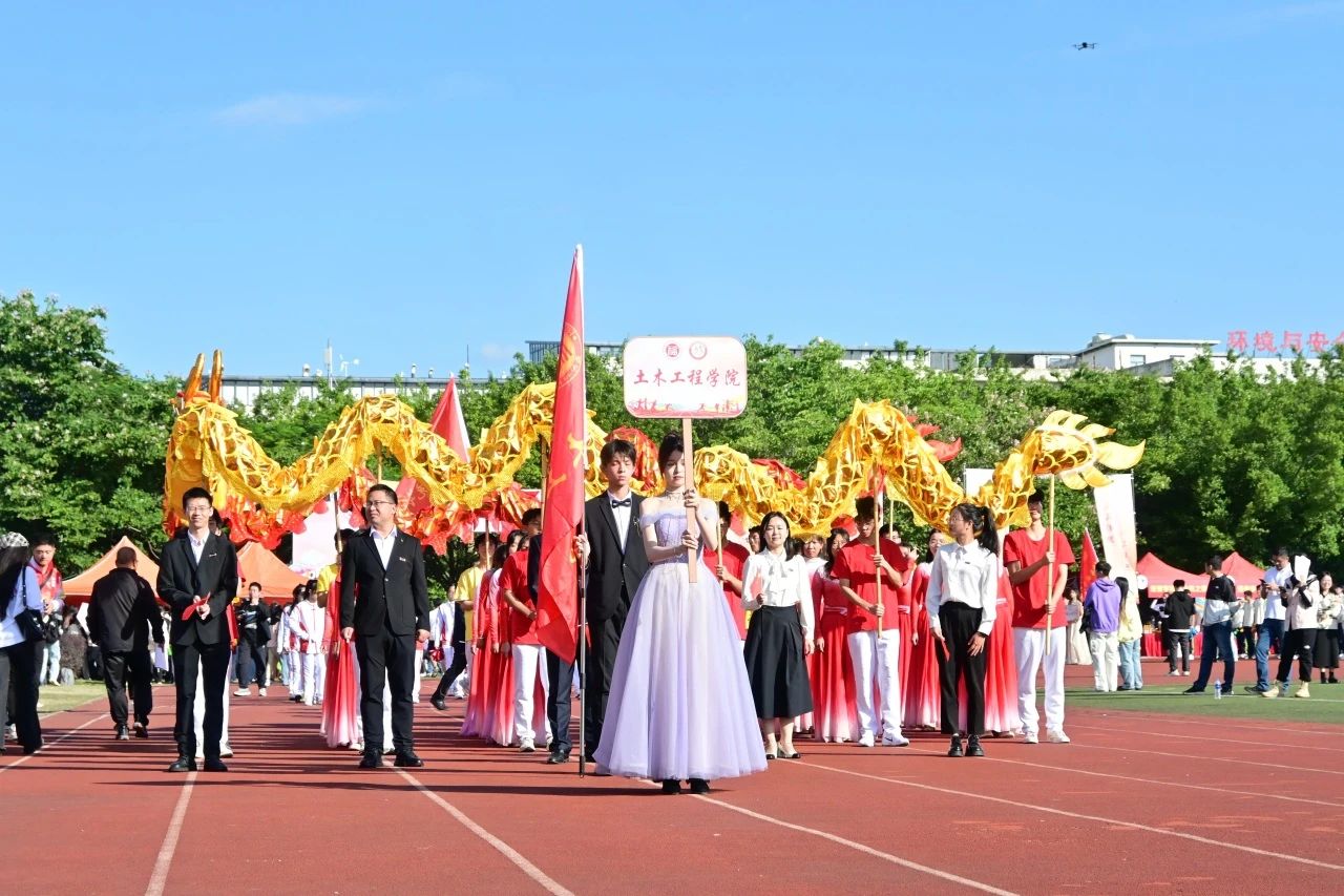 方阵队闪亮登场,老师同学们昂首挺胸,目光炯炯,迈着整齐划一的步伐步入田径场,行至主席台前停下脚步。伴随着音乐奏响,方阵迅速变换为表演队形。“红灯亮起舞龙腾,鼓奏飞花庆太平。”左右舞龙队员默契配合,龙在空中翻滚舞动、蜿蜒前行。盘旋的飞龙包裹着中间的舞蹈队员,她们手握桃红扇,表演着别具一格的国风舞蹈,为校运会的开幕又增添一抹热烈与阳光,精彩的演出引来全场响彻云霄的欢呼声,传统民俗与国风舞蹈的绝妙组合尽显土木学院的别样风采!