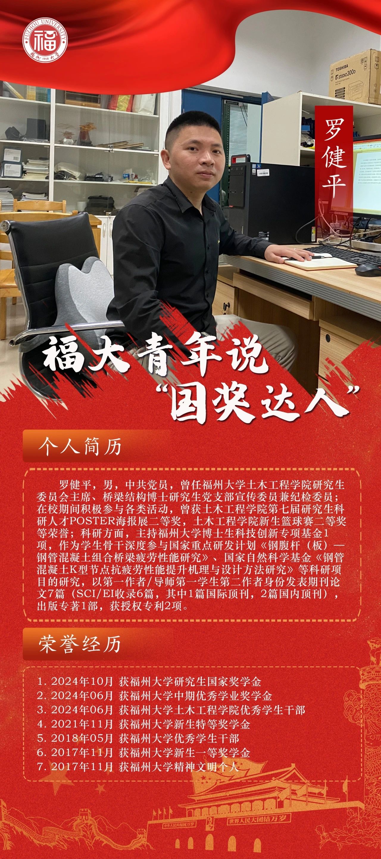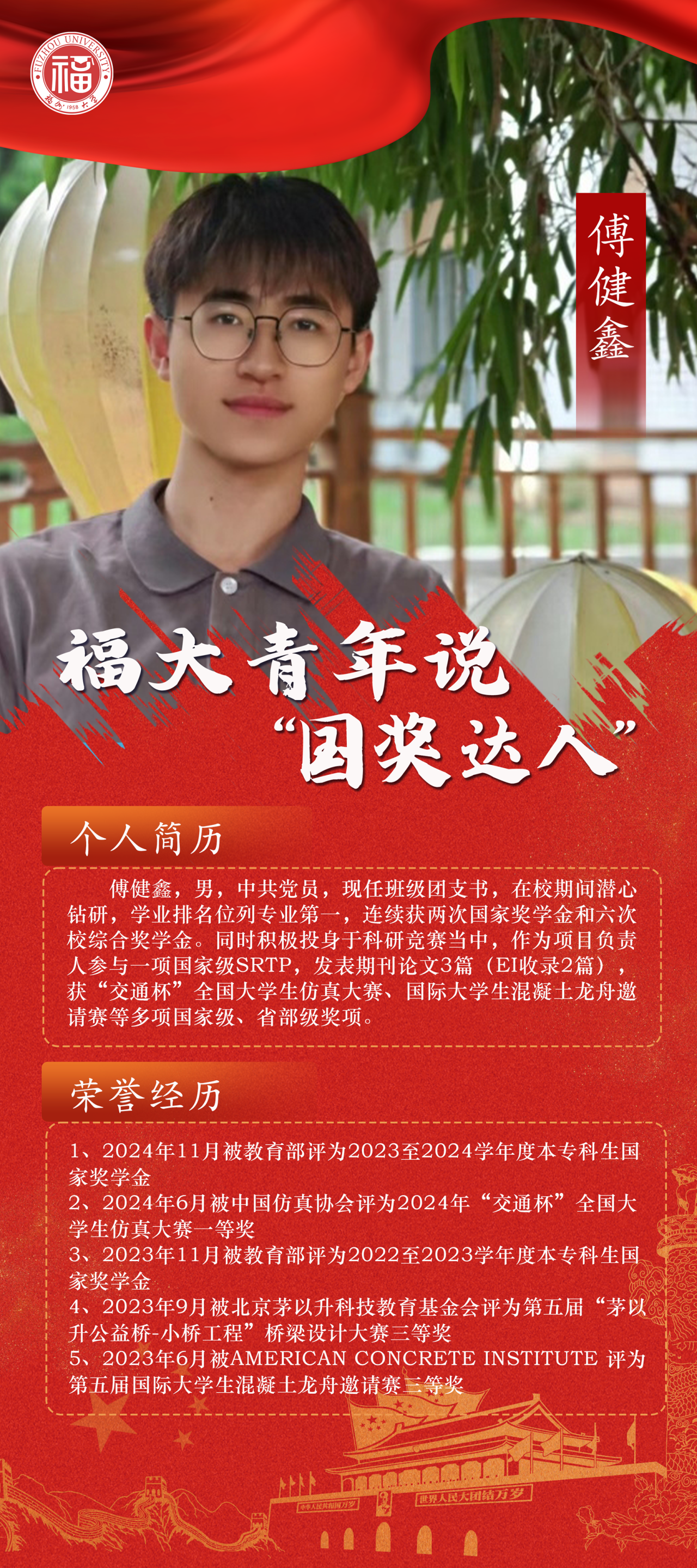 傅健鑫,男,中共党员,现任班级团支书,在校期间潜心钻研,学业排名位列专业第一,连续获两次国家奖学金和六次校综合奖学金。同时积极投身于科研竞赛当中,作为项目负责人参与一项国家级SRTP,发表期刊论文3篇(EI收录2篇),获“交通杯”全国大学生仿真大赛、国际大学生混凝土龙舟邀请赛等多项国家级、省部级奖项。