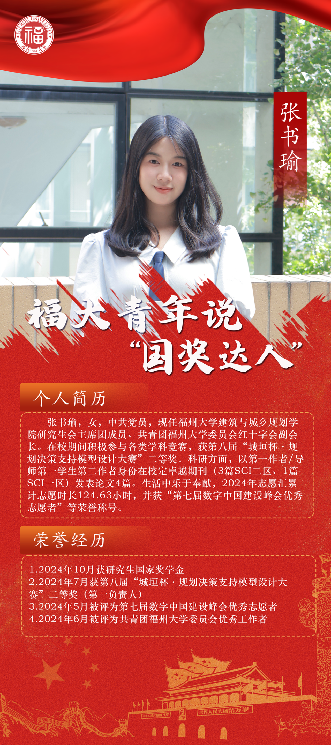 委员会红十字会副会长。在校期间积极参与各类学科竞赛,获第八届“城垣杯·规划决策支持模型设计大赛”二等奖。科研方面,以第一作者/导师第一学生第二作者身份在校定卓越期刊(3篇SCI二区、1篇SCI一区)发表论文4篇。生活中乐于奉献,2024年志愿汇累计志愿时长124.63小时,并获“第七届数字中国建设峰会优秀志愿者”等荣誉称号。