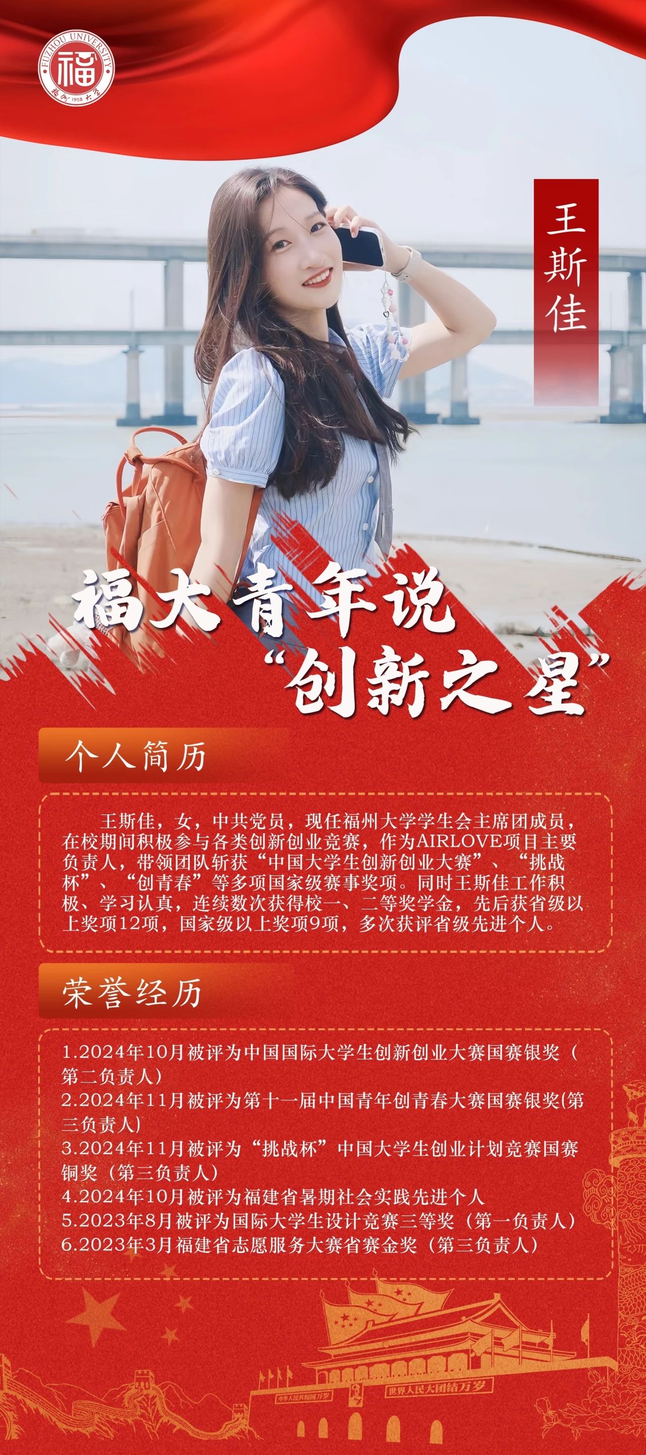 学生会主席团成员,在校期间积极参与各类创新创业竞赛,作为Airlove项目主要负责人,带领团队斩获“中国大学生创新创业大赛”、“挑战杯”、“创青春”等多项国家级赛事奖项。同时王斯佳工作积极、学习认真,连续数次获得校一、二等奖学金,先后获省级以上奖项12项,国家级以上奖项9项,多次获评省级先进个人。