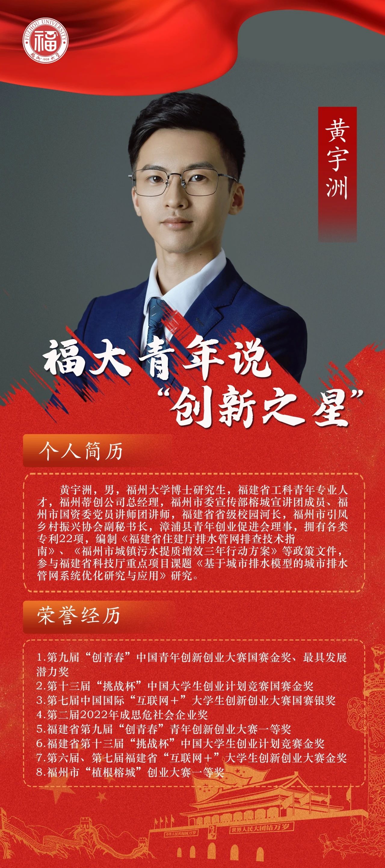 博士研究生,福建省工科青年专业人才,福州蒂创公司总经理,福州市委宣传部榕城宣讲团成员、福州市国资委党员讲师团讲师,福建省省级校园河长,福州市引凤乡村振兴协会副秘书长,漳浦县青年创业促进会理事,拥有各类专利22项,编制《福建省住建厅排水管网排查技术指南》、《福州市城镇污水提质增效三年行动方案》等政策文件,参与福建省科技厅重点项目课题《基于城市排水模型的城市排水管网系统优化研究与应用》研究。