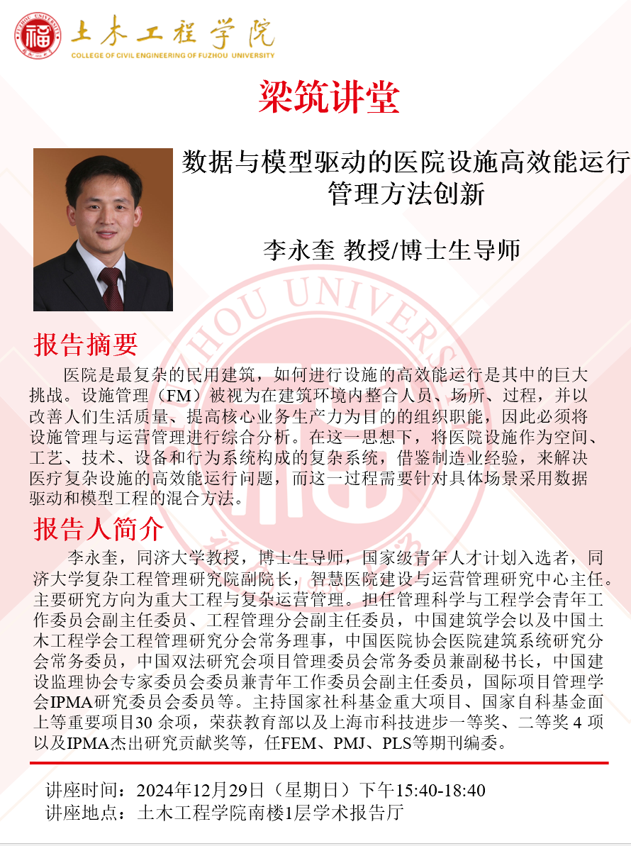第44期梁筑讲坛邀请到同济大学教授、博士生导师,国家级青年人才计划入选者,同济大学复杂工程管理研究院副院长,智慧医院建设与运营管理研究中心主任李永奎作“数据与模型驱动的医院设施高效能运行管理方法创新”的主题报告,欢迎大家积极参加。