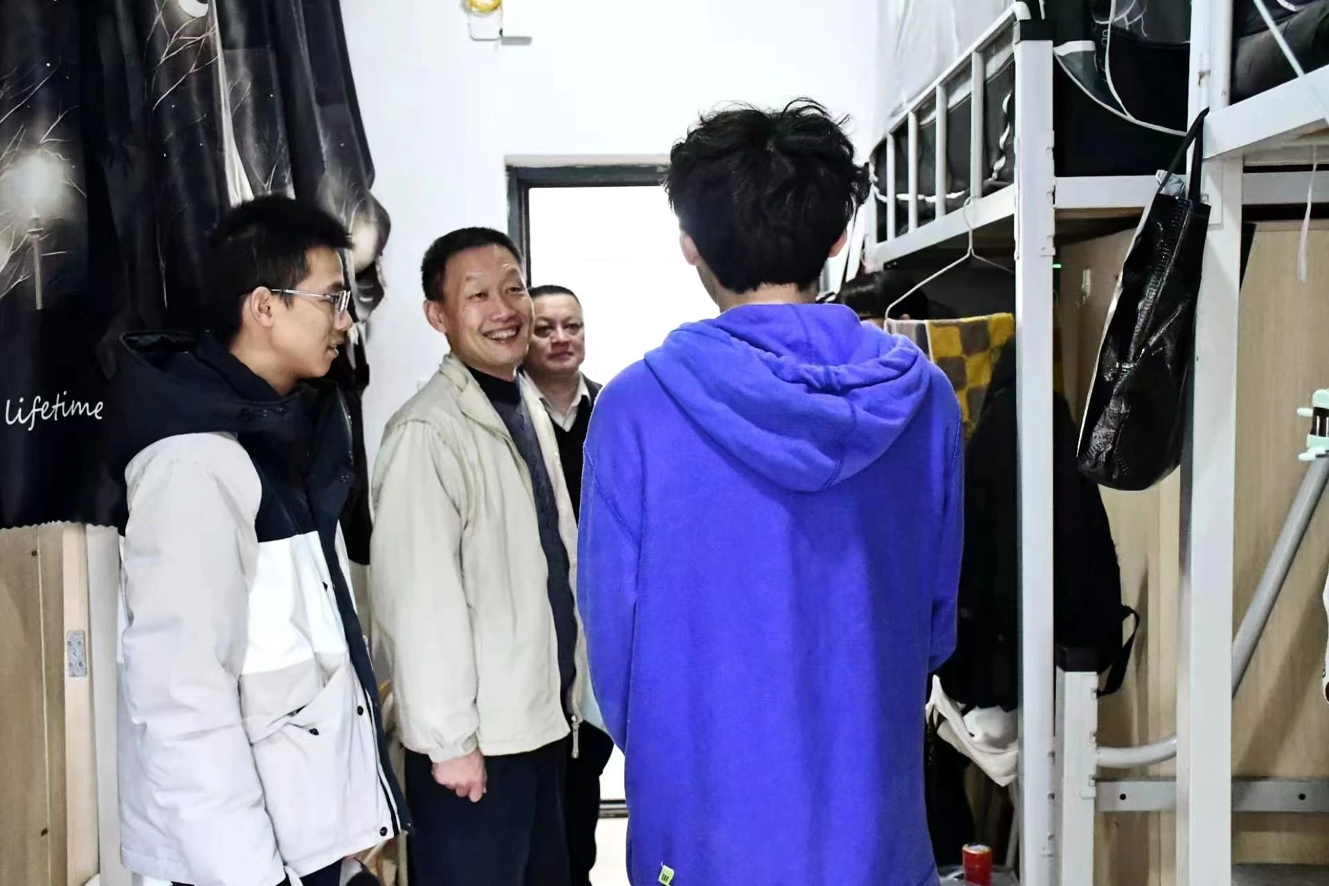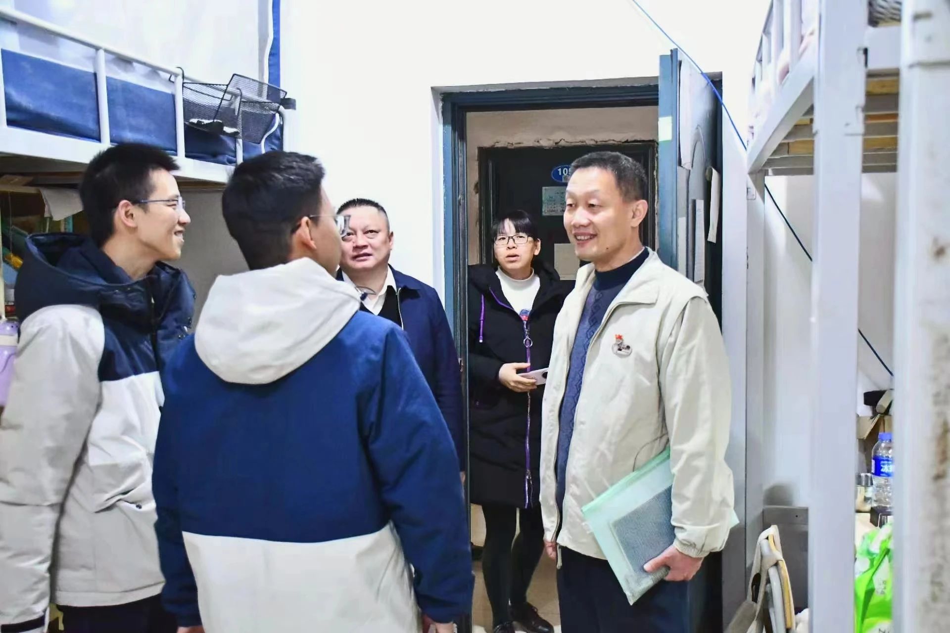 研究生会主席团成员谢戈尧的宿舍中,陈晓晖主任详细了解了他近来论文开题与学生工作的情况,并认可了其在服务学院同学方面作出的努力。在2024年国家奖学金获得者沈任扬的宿舍里,陈晓晖主任详细询问了他的生活和科研工作的情况,对其取得的科研成果给予了肯定,并勉励他要再接再厉,安排好科研时间,按期毕业。此外,陈晓晖主任一行还对宿舍安全卫生情况进行检查,提醒同学们加强防火、防盗、防诈骗以及用电、用水安全意识自觉遵守宿舍安全管理各项规定,养成良好的生活习惯,共创安全、和谐、美好的校园生活。