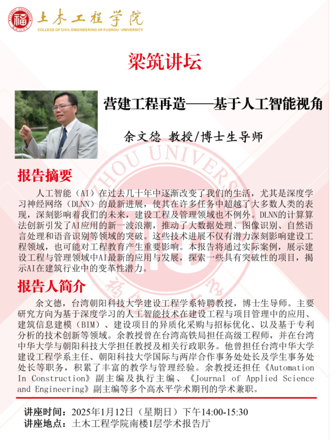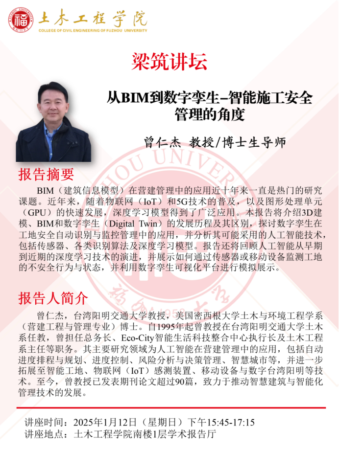 第45期“梁筑讲坛”特邀台湾朝阳科技大学建设工程学系特聘教授,博士生导师余文德作“营建工程再造--基于人工智能视角”的主题报告;台湾阳明交通大学教授,美国密西根大学土木与环境工程学系博士曾仁杰作“从BIM到数字孪生-智能施工安全管理的角度”的主题报告。欢迎大家积极参加。