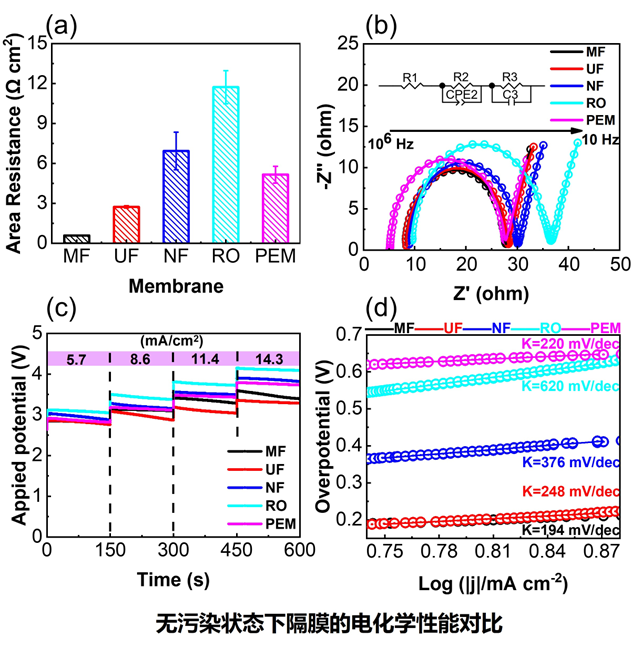 本研究首先对不同隔膜在无污染状态下的电化学性能进行测试,将微滤膜(MF)、超滤膜(UF)、纳滤膜(NF)、反渗透膜(RO)与PEM进行对比。研究结果显示,在无污染状态下,MF和UF表现出比PEM更好的电化学性能,pH调控能力相当。这些结果初步说明了隔膜替代可行性。