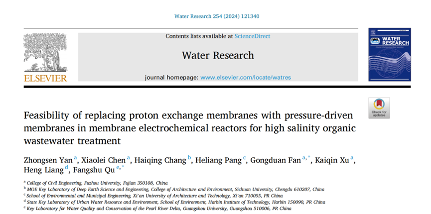范功端教授课题组发表了题为“Feasibility of replacing proton exchange membranes with pressure-driven membranes in membrane electrochemical reactors for high salinity organic wastewater treatment”(基于压力驱动膜的膜电化学反应器处理高盐有机废水的可行性研究)的研究成果。该论文发表在水环境领域顶级学术期刊Water Research上,JCR一区,中科院分区一区,TOP期刊,最新影响因子11.4。本研究获得国家自然科学基金(52370069,52170072)的支持。鄢忠森副研究员为第一作者,陈肖磊硕士生为第二作者,范功端教授和瞿芳术教授(广州大学)为共同通讯作者。