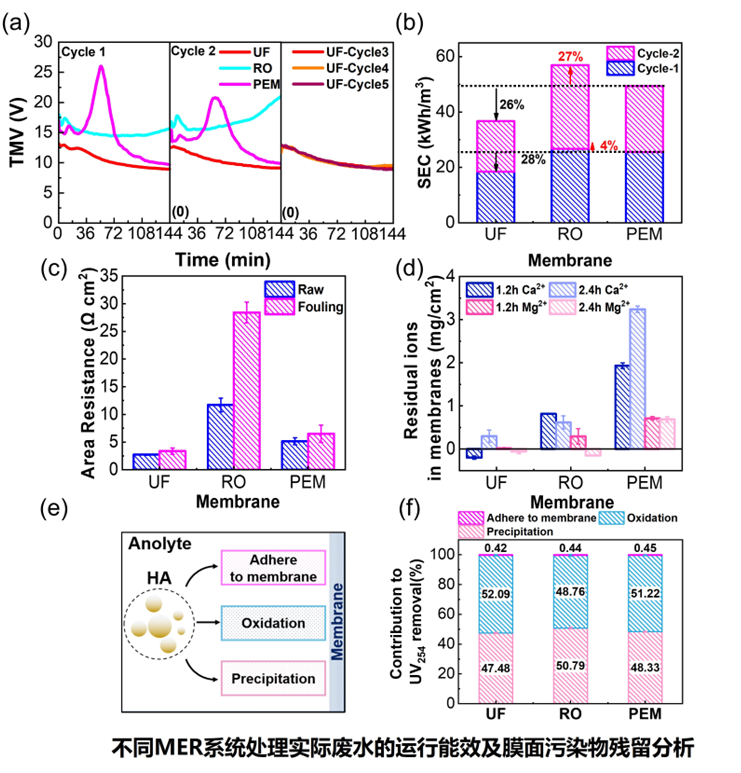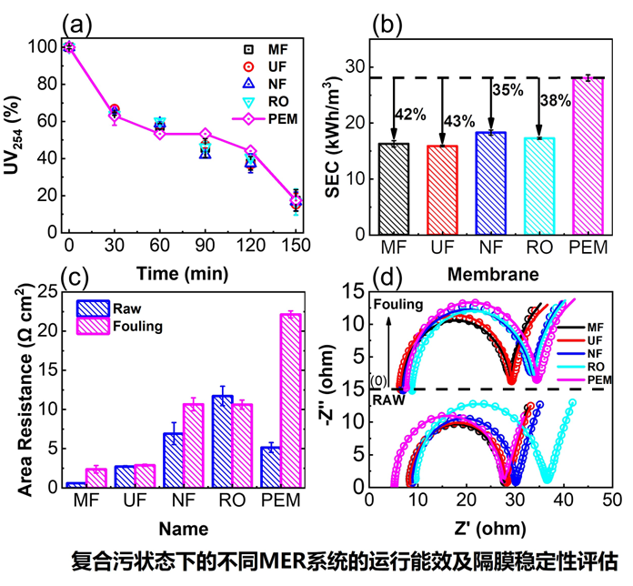 进一步地,在模拟废水中测试了不同MER系统的运行能效,并对隔膜运行复合污染后的稳定性进行评估,以电化学性能的变化情况来对压力驱动膜进行初步筛选。研究结果显示,当进料中存在污染物(腐殖酸、Ca2+和Mg2+)时,在相似的UV254去除率(~85%)下,UF和RO的膜电阻表现出较低的变化率(<5%)。