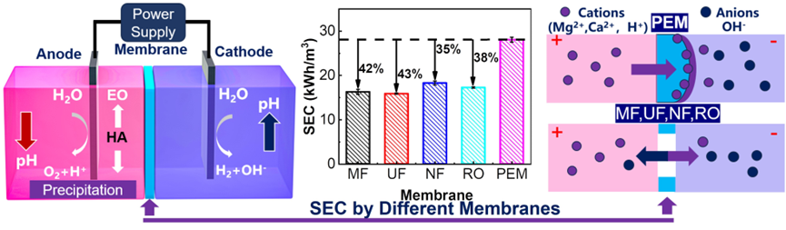 本工作验证了在MER中以压力驱动膜替代PEM处理HSOW的可行性。在MER工艺中使用松散的压力驱动膜(UF)来替代PEM提供了巨大的优势,特别是膜成本(从1000降低到27 $ m-2)。通过在MER系统中使用UF,在模拟HSOW处理中节省了43%的电能,并且在5个周期的实际废水处理中保持稳定的性能。阳极液的酸化和氧化作用显著减轻了废水中有机-无机物的络合污染,阴极液中的碱化作用对软化废水具有重要意义。总体而言,这种低成本、易于组装的MER设计不仅对下一代EO工艺的开发具有重要意义,而且能够适应多种废水处理场景。此外,在处理过程中可以回收氢气和腐殖酸等潜在资源,从而增强MER的经济可行性。