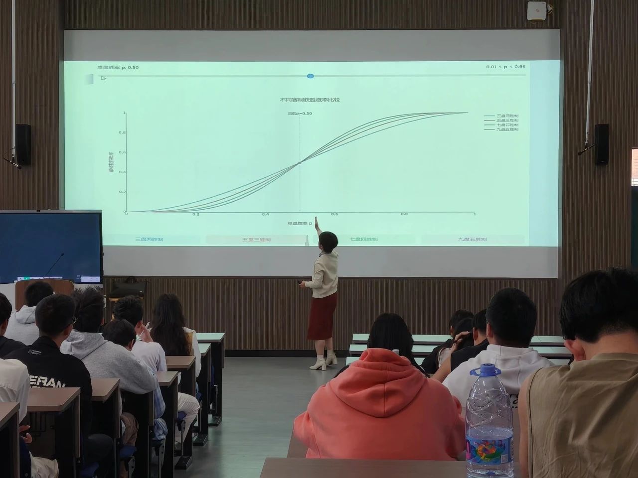 在讲解概率统计的应用时,薛老师巧妙避开了枯燥的理论灌输,而是列举一系列生动有趣的案例,如通过分析射击问题中的先后手区别、不同赛制下下棋比赛的胜率,让同学们直观感受到概率论在日常生活中的作用。同时,薛老师还展示了概率论在前沿领域的关键应用,从大数据分析到著名的“女士品茶”问题,从神威太湖之光超级计算机的运行原理到投资策略的选择……不仅让同学们看到了概率统计的广泛应用,也激发了大家学习概率论的热情和兴趣。