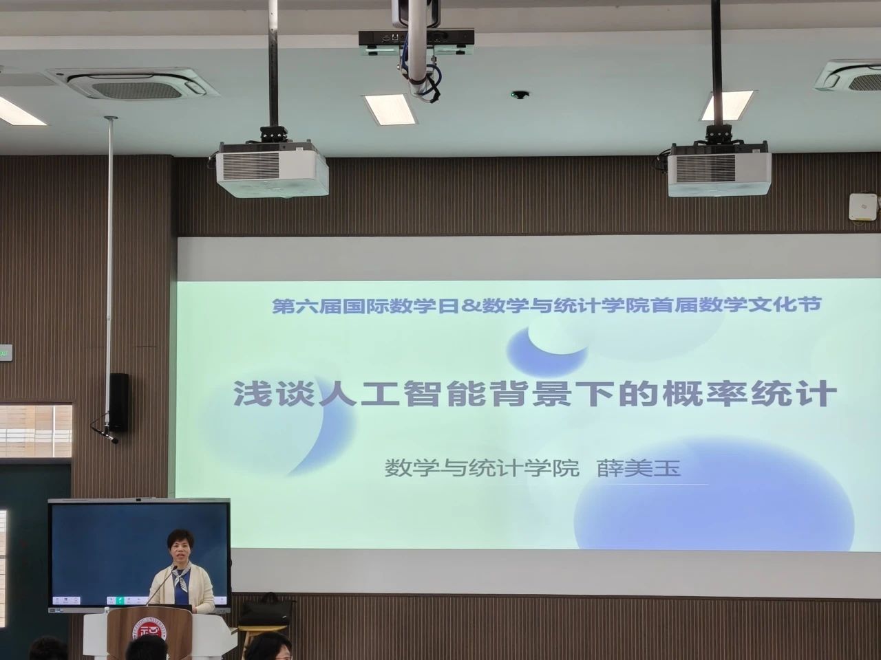 邀请数学与统计学院薛美玉副教授在东3-100教室开展主题为“浅谈人工智能背景下的概率统计”的讲座,辅导员林婧以及2023级本科生参加讲座。