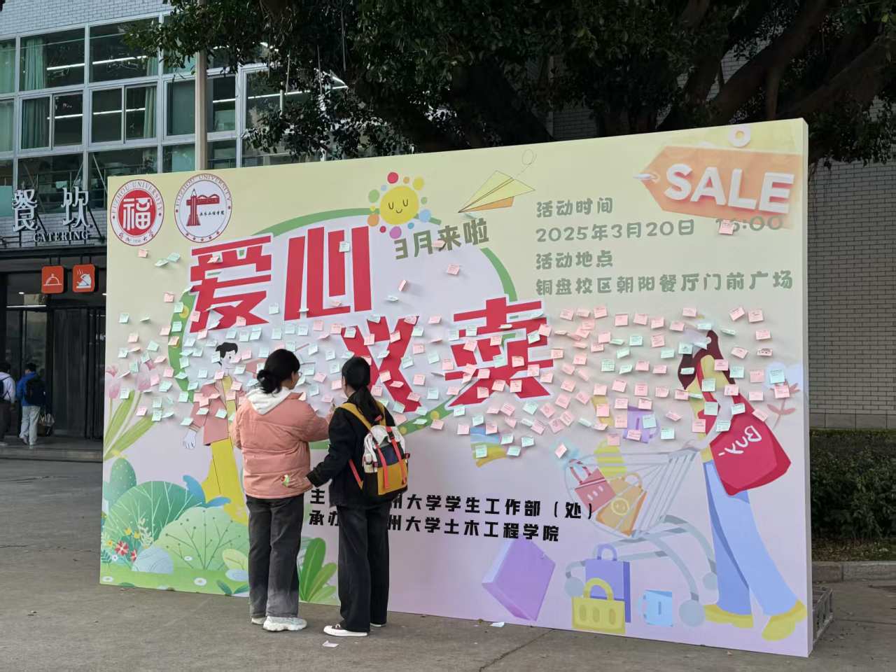当踏入义卖会现场,首先吸引眼帘的是爱心义卖公益宣传海报,“温暖如初,携手福大”的标语瞬间拉近大手与小手之间的距离。