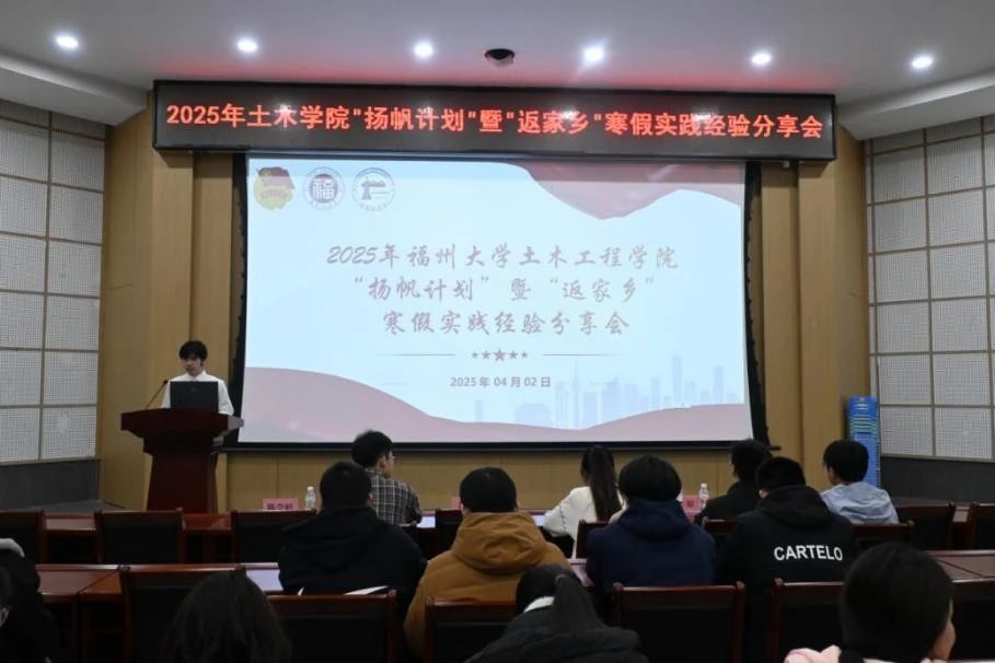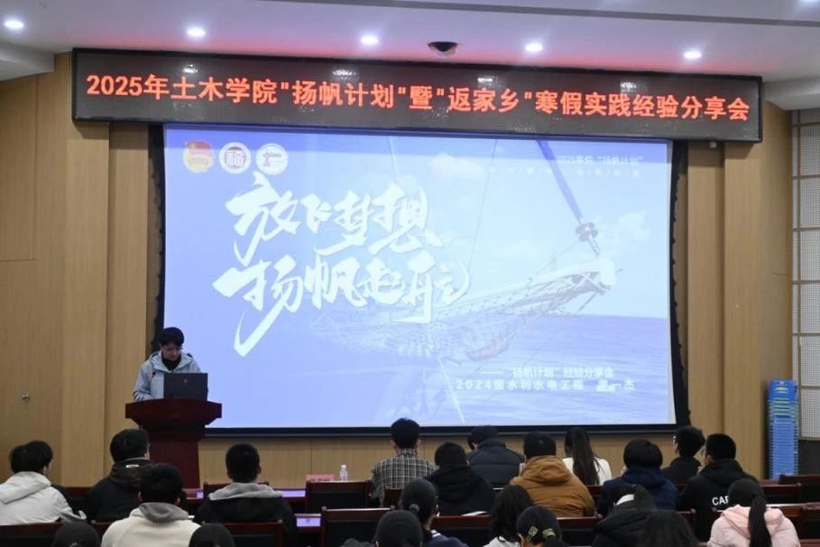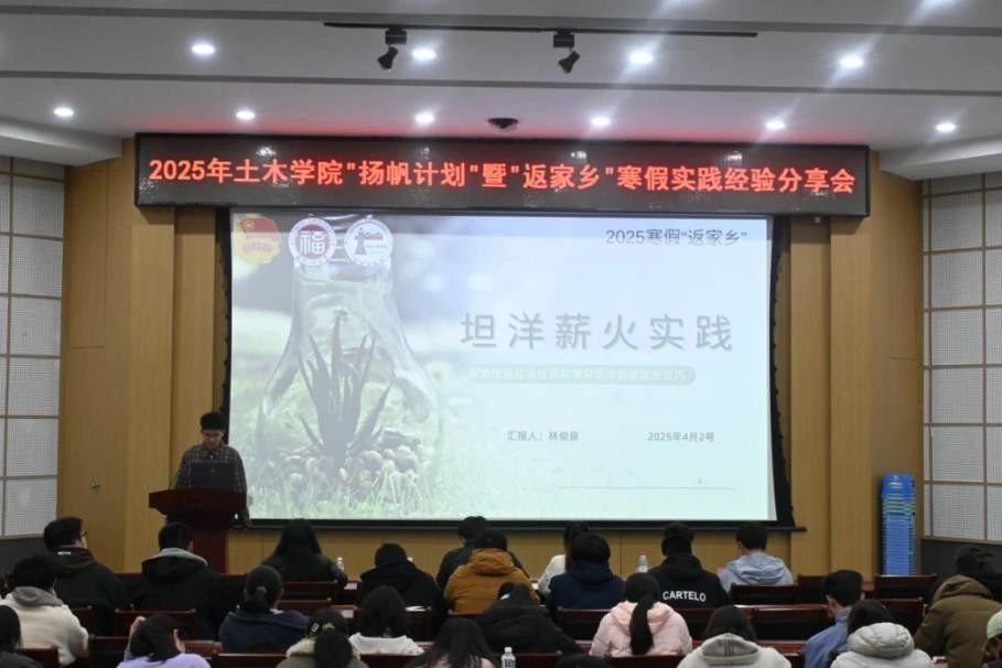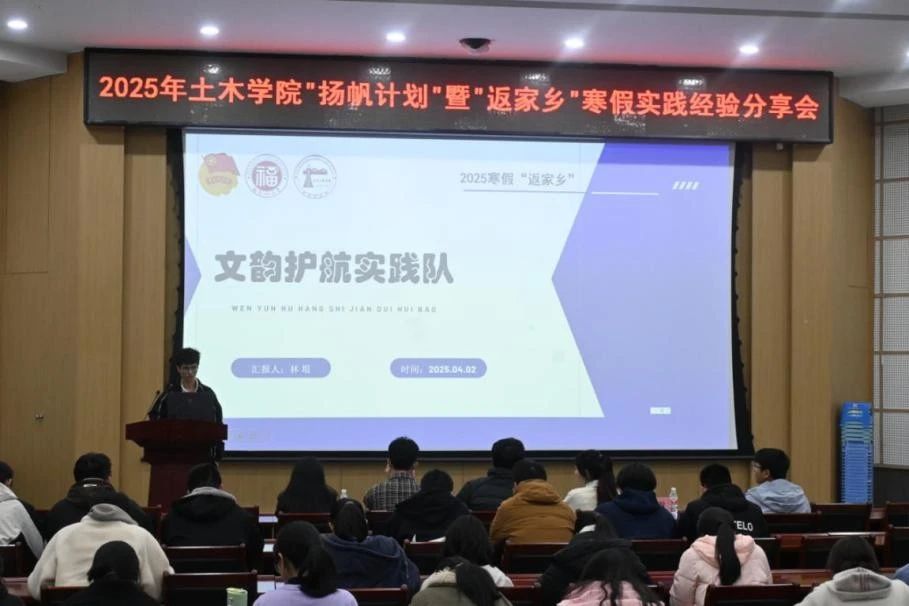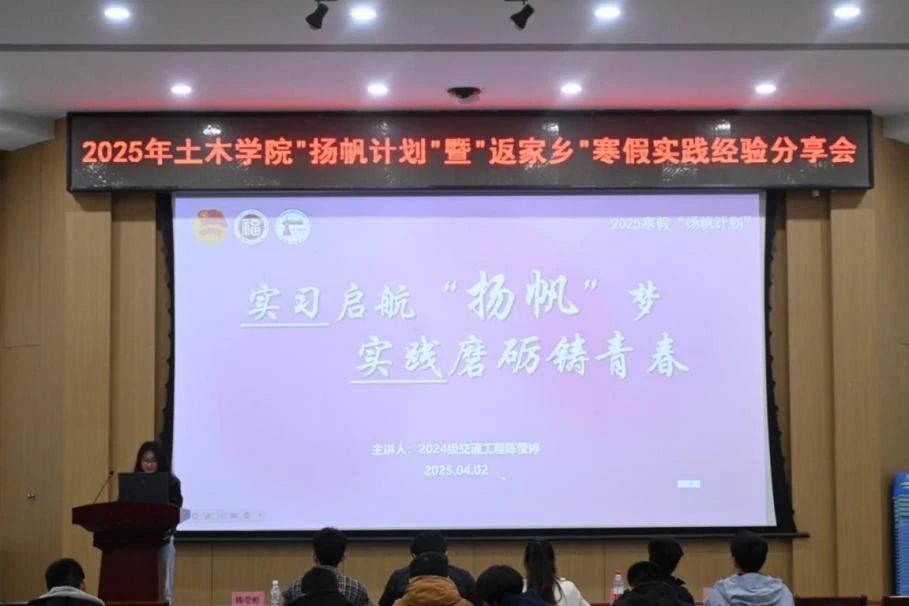 在“扬帆计划”经验分享环节,来自2024级水利水电工程的黄一杰同学率先登台,分享了在福建省南安市码头镇人民政府中实习的所见所闻,他深入基层,协助处理镇村日常事务,积极参与到镇里春节系列文化活动的组织工作当中,通过与当地居民的接触和交流,深刻意识到作为青年学子所肩负的责任。随后,来自2024级交通工程的陈莹婷同学分享了寒假在陪读营实习的宝贵经验,她以细腻的观察和深刻的思考,为大家揭示了基层组织工作中所蕴含的挑战机遇和成长空间。两位同学的分享,不仅让现场的观众们领略到了“扬帆计划”作为实践育人平台的独特魅力,更激发了同学们投身实践活动的社会责任感和报国热情。