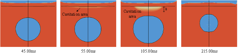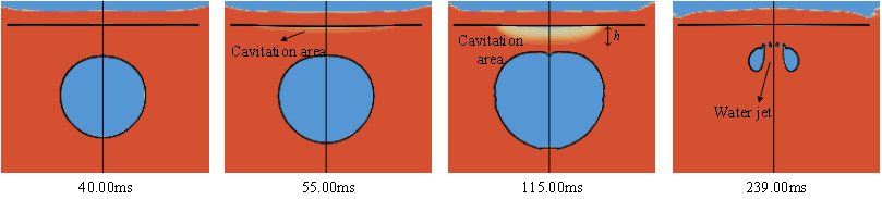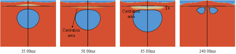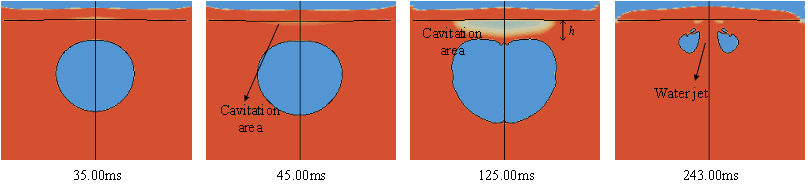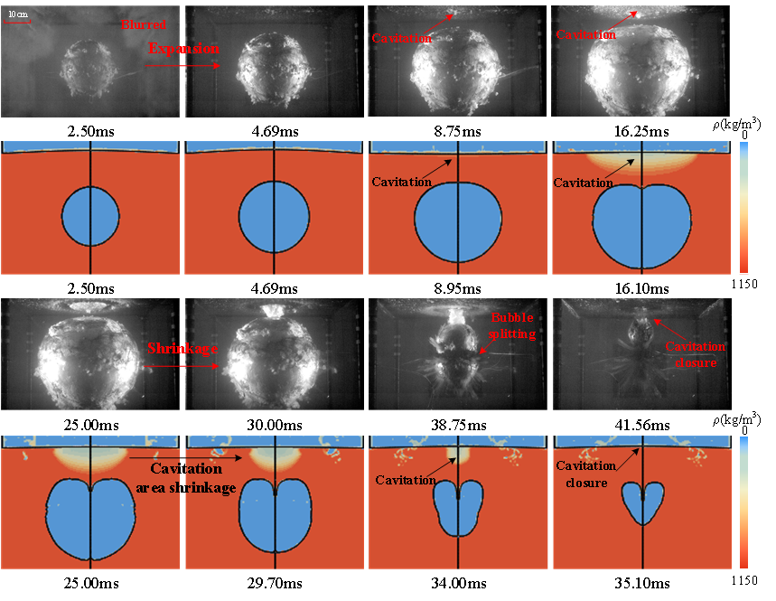 随着现代军事技术发展进步,舰船等海上作战平台易遭受多种形式的水下武器爆炸攻击,使舰船丧失作战能力。近场水下爆炸过程是高度非线性的,伴随着强烈的激波、空化、气泡脉动、水射流、滞回流、破片等。早期学者们的研究主要集中于冲击波载荷、气泡载荷与水射流载荷,对于空化效应的溃灭载荷研究较少。大量试验表明空化区域的溃灭载荷会对结构产生二次加载现象,空化溃灭载荷对舰船结构的影响不可忽略。现阶段的研究多集中于冲击波阶段,但是通过小装药近场水下爆炸实验,发现在气泡脉动阶段,由于气泡的运动会在结构表面形成局部空化区域,这个空化区域相较于冲击波阶段的空化区域更加明显,空化区域体积更大。对于气泡脉动阶段的局部空化的研究寥寥无几,其产生机理,影响因素,溃灭载荷等都有待深究。