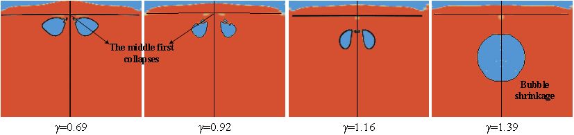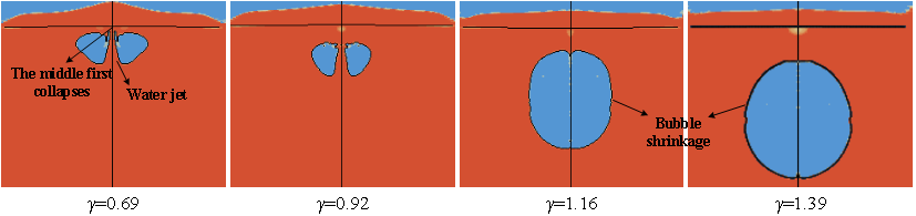 (3)随着板厚的增加,空化区域的最大高度与最大体积呈减小趋势,当板厚增加到一定程度后不再出现空化现象;系列仿真显示空化闭合有两种模式:一种是从两边向中间自然闭合;一种是受水射流冲击影响从中部先闭合。当药量相同,γ在一定范围内,空化区域最大高度随着距离参数增加而增加,但是增加的百分比减小。空化区域最大体积在距离参数γ=1左右时达到最大,过大或过小都会使空化区域最大体积减小。