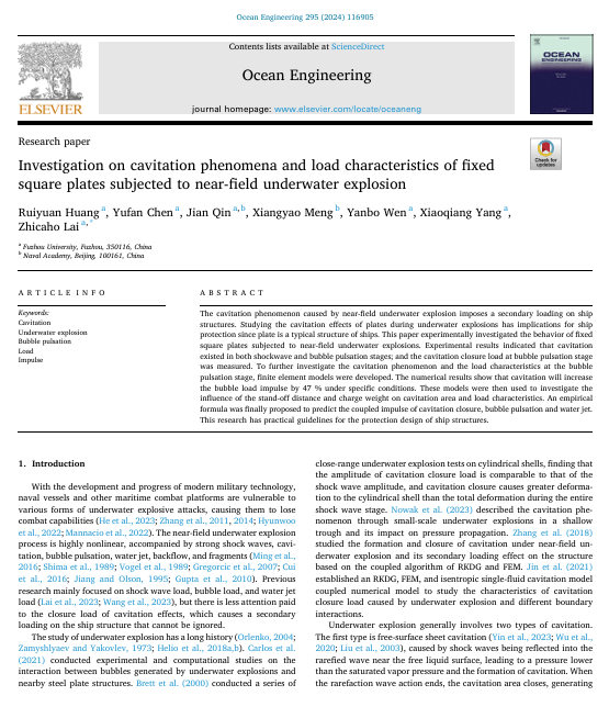 黄瑞源研究员、硕士生陈钰帆、秦健教授、博士生文彦博、杨晓强教授、赖志超教授(通讯作者)和海军研究院孟祥尧合作发表了题为“Investigation on cavitation phenomena and load characteristics of fixed square plates subjected to near-field underwater explosion”(近场水下爆炸下固支方板的空化现象和载荷特性研究)的研究成果。该论文发表在国际海洋工程顶级学术期刊Oceaning上, 该期刊系SCI检索期刊,中科院分区一区,最新影响因子为4.6。本研究获得国家自然科学基金项目(No.12172178)的支持。论文链接://doi.org/10.1016/j.oceaneng.2024.116905。”