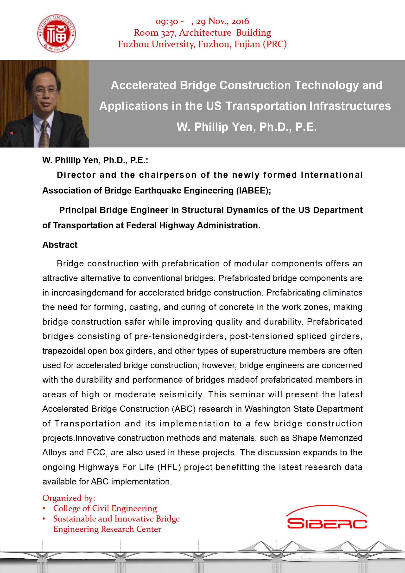 11月29日上午9:30,美国W.Phillip Yen, Ph.D.,P.E.将在建筑学院327会议室为大家带来主题为“Accelerated Bridge Construction Technology and Applications in the US Transportation Infrastructures”的前沿报告。热烈欢迎大家参加。详情请见海报。