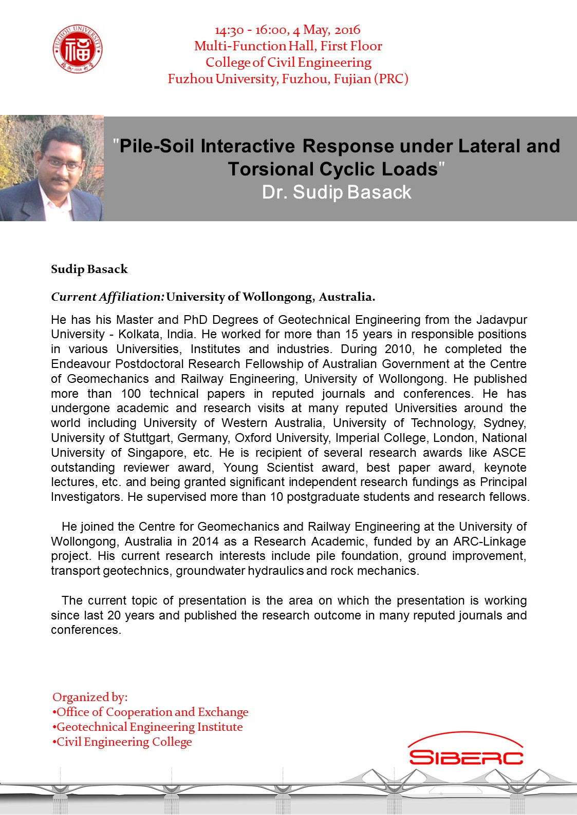 2016年5月4日下午14:30 - 16:00, 在肉便器 一楼多功能厅举办澳大利亚卧龙岗大学Sudip Basack博士关于“Pile-Soil Interactive Response under Lateral and Torsional Cyclic Loads”讲座,欢迎大家参加!