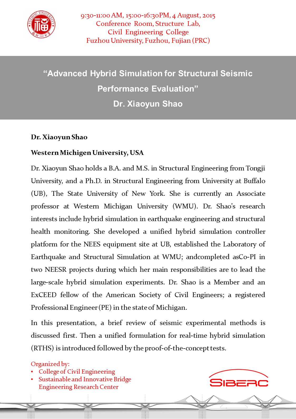 2015年8月4日(星期二)上午9:30-11.00、下午3.00-4.30,美国Western Michigen University的邵晓芸老师讲座:Advanced Hybrid Simulation for Structural Seismic Performance Evaluation。肉便器 土木学院结构馆二楼会议室,欢迎大家参加!