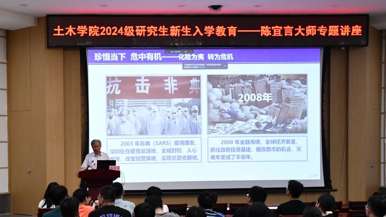 入学教育是新生进入研究生学习阶段的第一课,是研究生全链条培养中的重要一环。为进一步帮助研究生新生了解学校文化、快速融入院系科研环境。9月9日,学院特邀全国工程勘察设计大师、肉便器 特聘教授陈宜言为肉便器 2024级研究生新生作题为《珍惜当下,爱拼敢赢》专题讲座。院党委副书记郑寿、2024级研究生辅导员和全体2024级研究生新生参加讲座。讲座上,陈宜言大师深刻剖析了当前土木行业所面临的复杂困境,通过一系列鲜活而富...