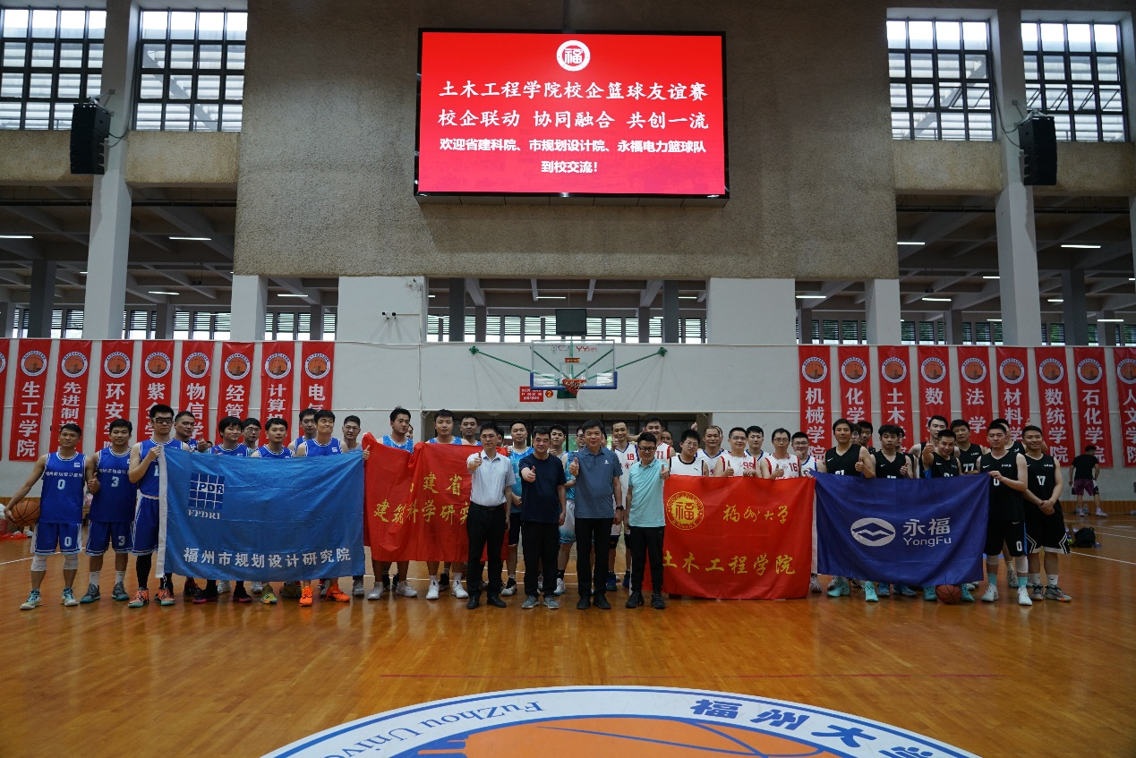 为深入学习贯彻党的二十大精神,推动学习贯彻习近平新时代中国特色社会主义思想主题教育走深走实、见行见效,土木工程学院于5月22日下午在旗山校区风雨操场举办了一场主题为“校企联动,协同融合,共创一流”的校企篮球友谊赛,邀请坐落于福州高新区的福建省建筑科学研究院有限责任公司、福州市规划设计研究院集团有限公司、福建省永福电力设计股份有限公司三支企业男子篮球队参赛。省建科院党委书记兼董事长叶健,永福电力副总经理卢庆议和土木工程学院党委书记黄培明、副书记郑寿等领导到场观赛指导。
