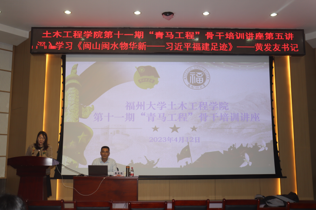 本次报告有幸邀请到福州大学马克思主义学院党委书记黄发友教授为青马学员、学生骨干作“《读懂总书记在福建故事,坚定理想信念——深入学习《闽山闽水物华新——习近平福建足迹》”主题讲座。报告由青马班班主任、院团委副书记江小敏主持。